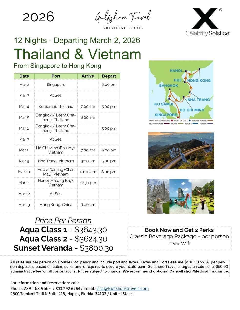 Embark on Celebrity's cruise tour to Thailand and Vietnam, where you'll explore stunning scenery and vibrant cities. Immerse yourself in local culture with visits to temples, savor authentic flavors in Ho Chi Minh City, and marvel at Halong Bay's limestone islands. This itinerary includes overnight stays in two cities for extended exploration, expert guides to enrich your experience, and tailored activities like cooking classes and traditional performances.